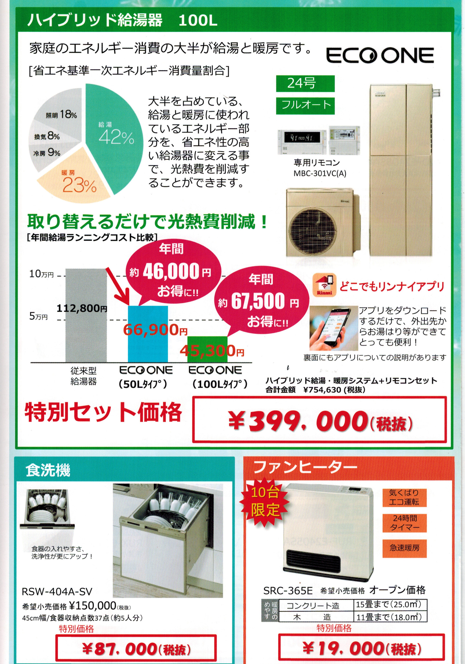 ハイブリッド給湯器、食洗機、ファンヒーター